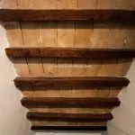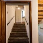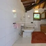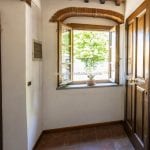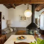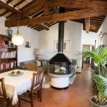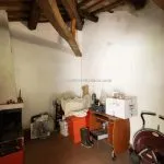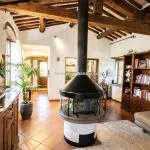 The entrance leads to an internal stone staircase connecting to the upper level, where a central hallway provides access to all rooms. The bathroom is fully equipped and in excellent condition. The living room includes two large windows overlooking the countryside and has traditional wooden beam ceilings with exposed terracotta tiles. The adjacent kitchenette, which could be easily converted into an open-plan layout, is visually separated from the living area by a distinctive circular fireplace that functions as a focal point for the space.