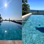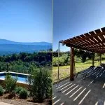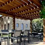 The landscaped garden (1,100 m²) includes a 10 × 3 m infinity pool lined with natural stone and a shaded outdoor dining area with panoramic views. Two private wells provide water for irrigation.