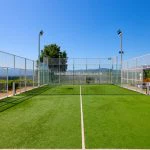 A separate 93-sqm fitness area provides gym space and changing rooms with two bathrooms. The surrounding garden area measures 15,500 sqm and includes gravel paths, mature trees, and a 14 × 6.5 m swimming pool with a stone solarium. The estate also has two padel courts, which have hosted competitive events.