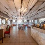 The ground floor includes a large restaurant with bar, professional kitchen, three guest restrooms, and staff service areas.