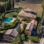 The property, encompassing 18 hectares (44.5 acres) in the enchanting Valdichiana hills spanning the provinces of Arezzo and Siena, is enveloped by a lush 10,000-square-metre park, bordered by hedges, stone walls, and paved driveways. Two inviting swimming pools grace the property, with a 12 × 6 metre pool exclusively designated for the villa, while a larger 24 × 6 metre pool is shared by the guests residing in the Agriturismo apartments, conveniently positioned on a stone-paved terrace adjacent to the building.