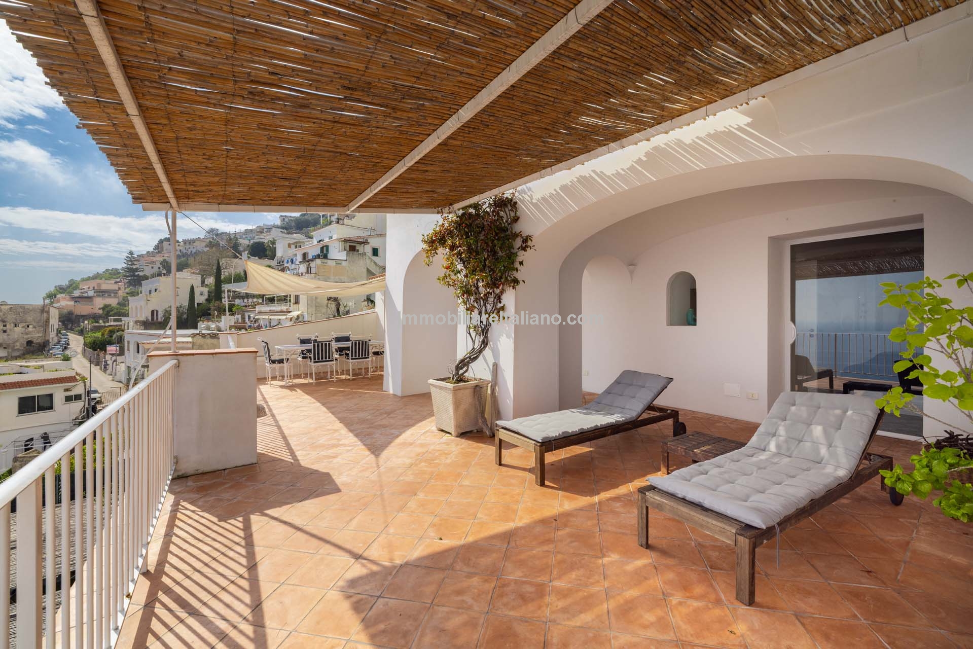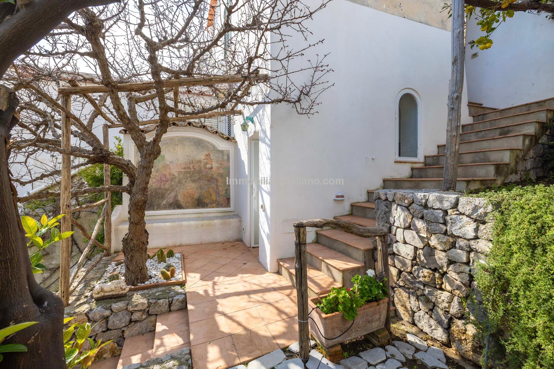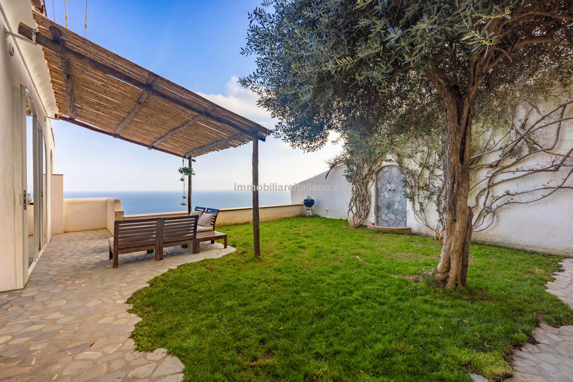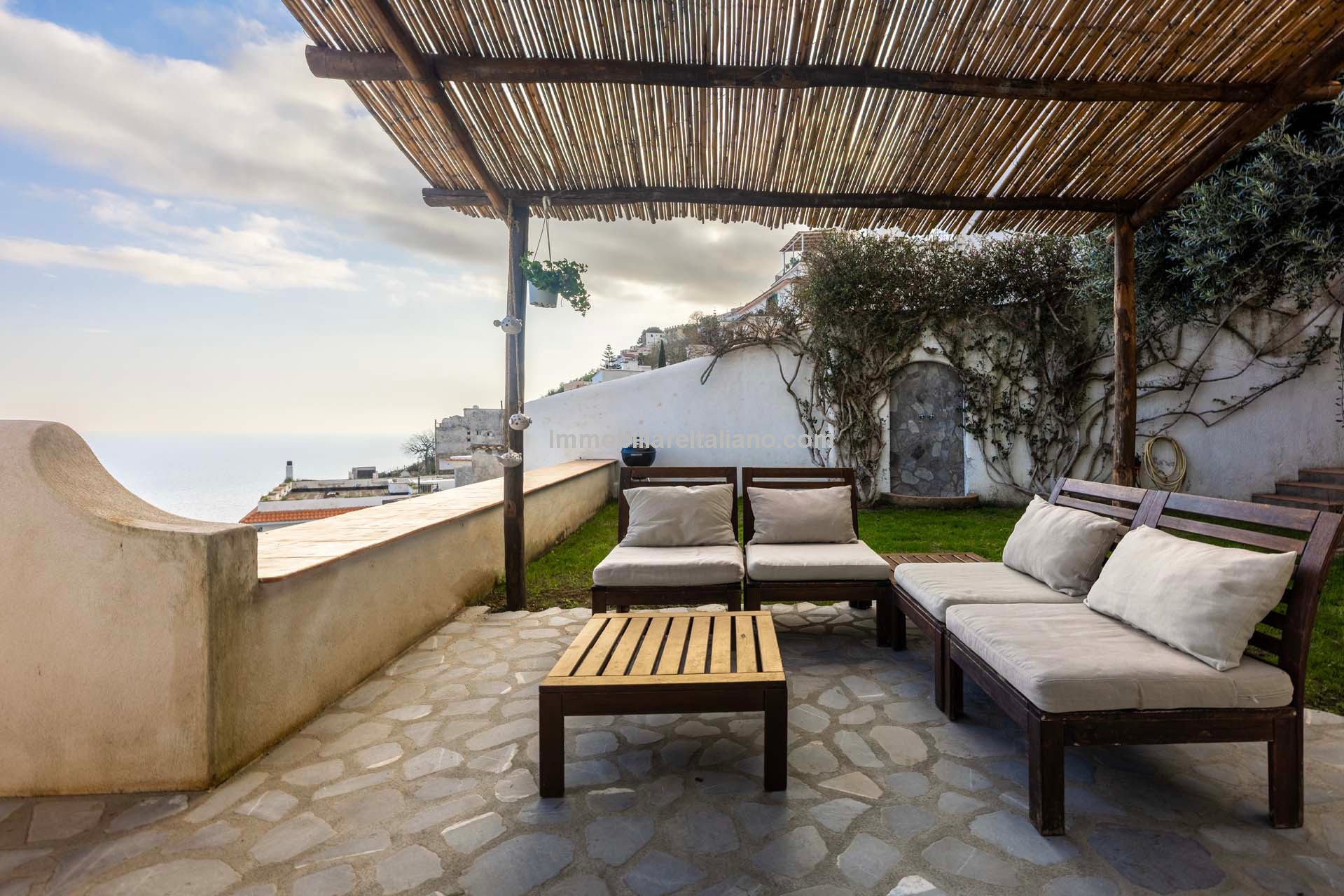 This property for sale in Italy with sea views is located in the historic centre of Praiano, one of the most sought-after locations within the Amalfi Coast real estate market. The apartment is fully restored and positioned to take advantage of open coastal views, with direct access via a private staircase leading through the garden.
