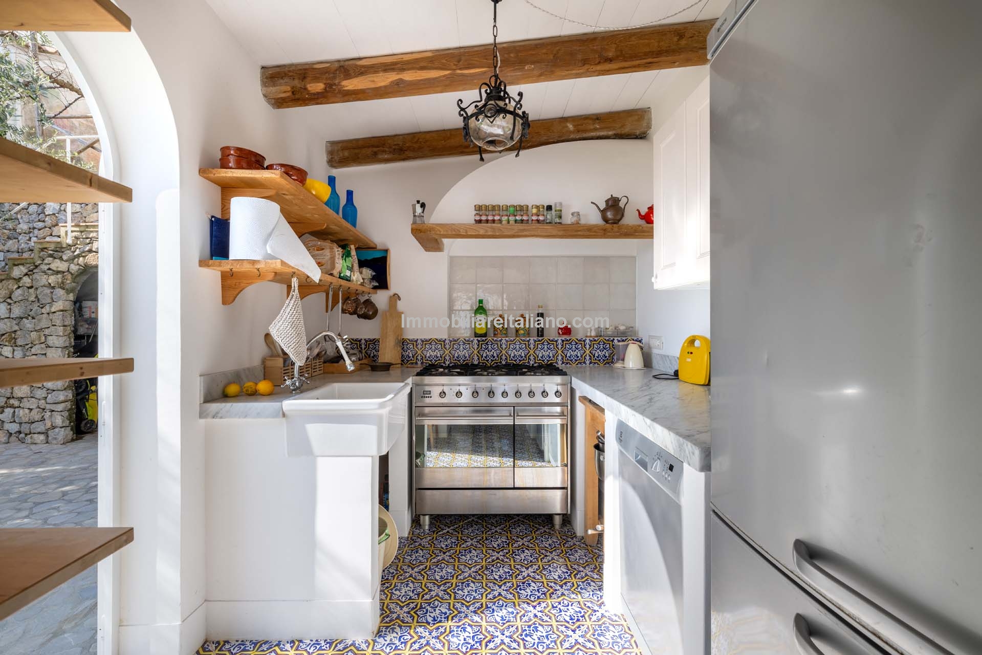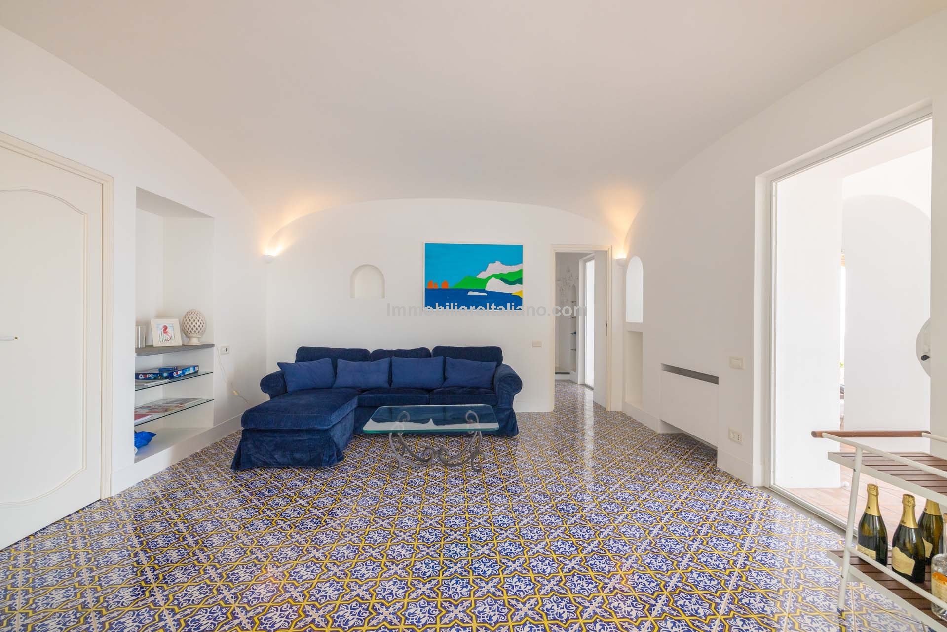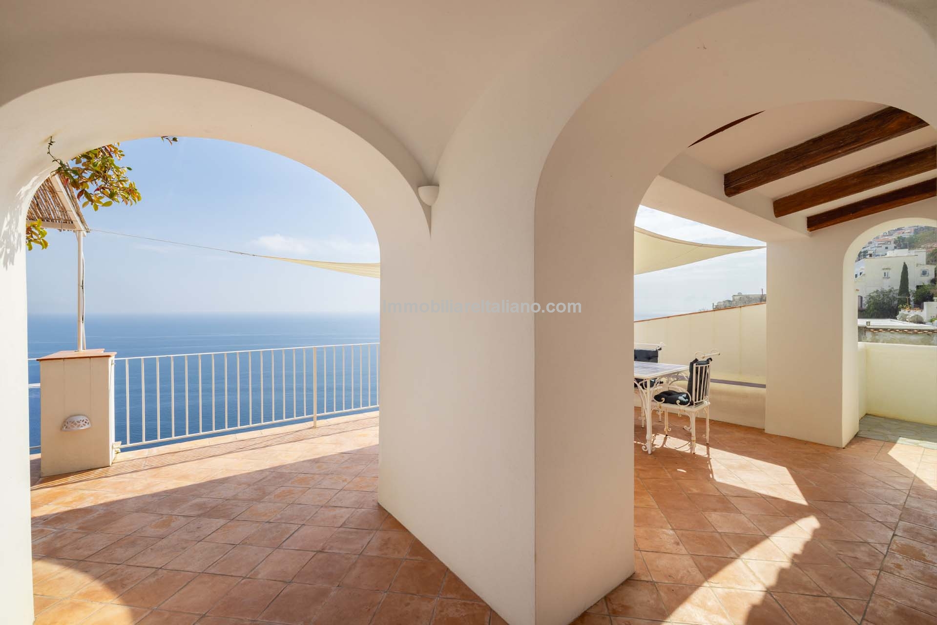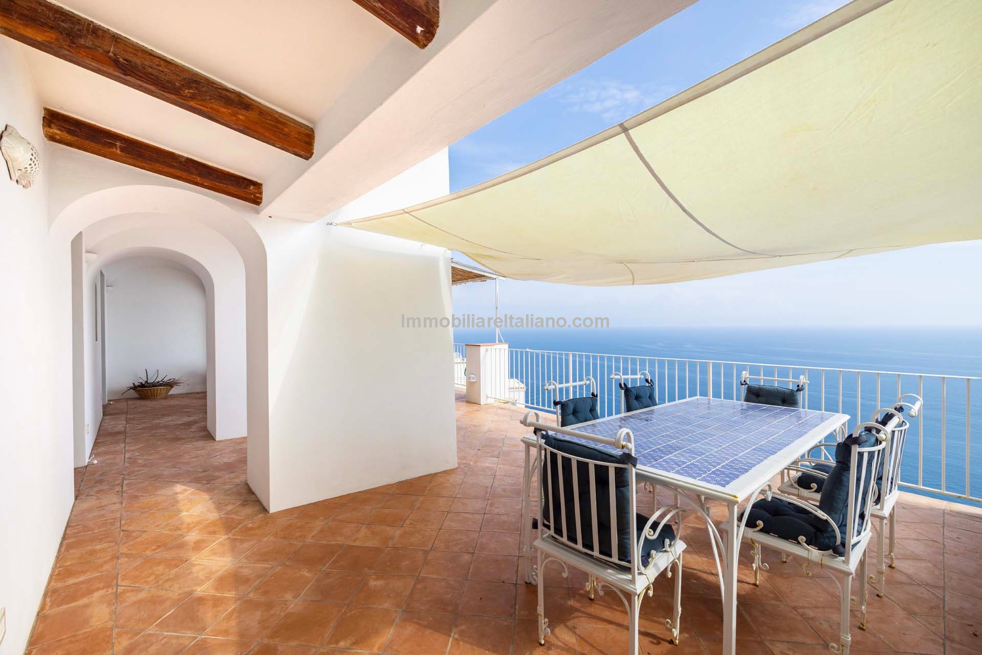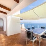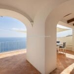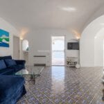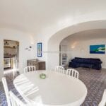 The apartment extends to approximately 113 square metres (1,216 sq ft) and is arranged on a single level. The internal layout includes a living room with a dining area connected to the kitchen, both of which open towards the sea-facing terrace. The terrace measures around 55 square metres and provides usable outdoor space with a covered portico, suitable for dining and seating while overlooking the coastline. Original architectural elements, such as vaulted ceilings, wooden beams, and decorated ceramic flooring, are preserved throughout, enhancing character and value in the Amalfi Coast property for sale segment.