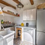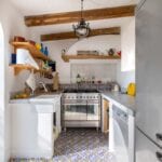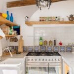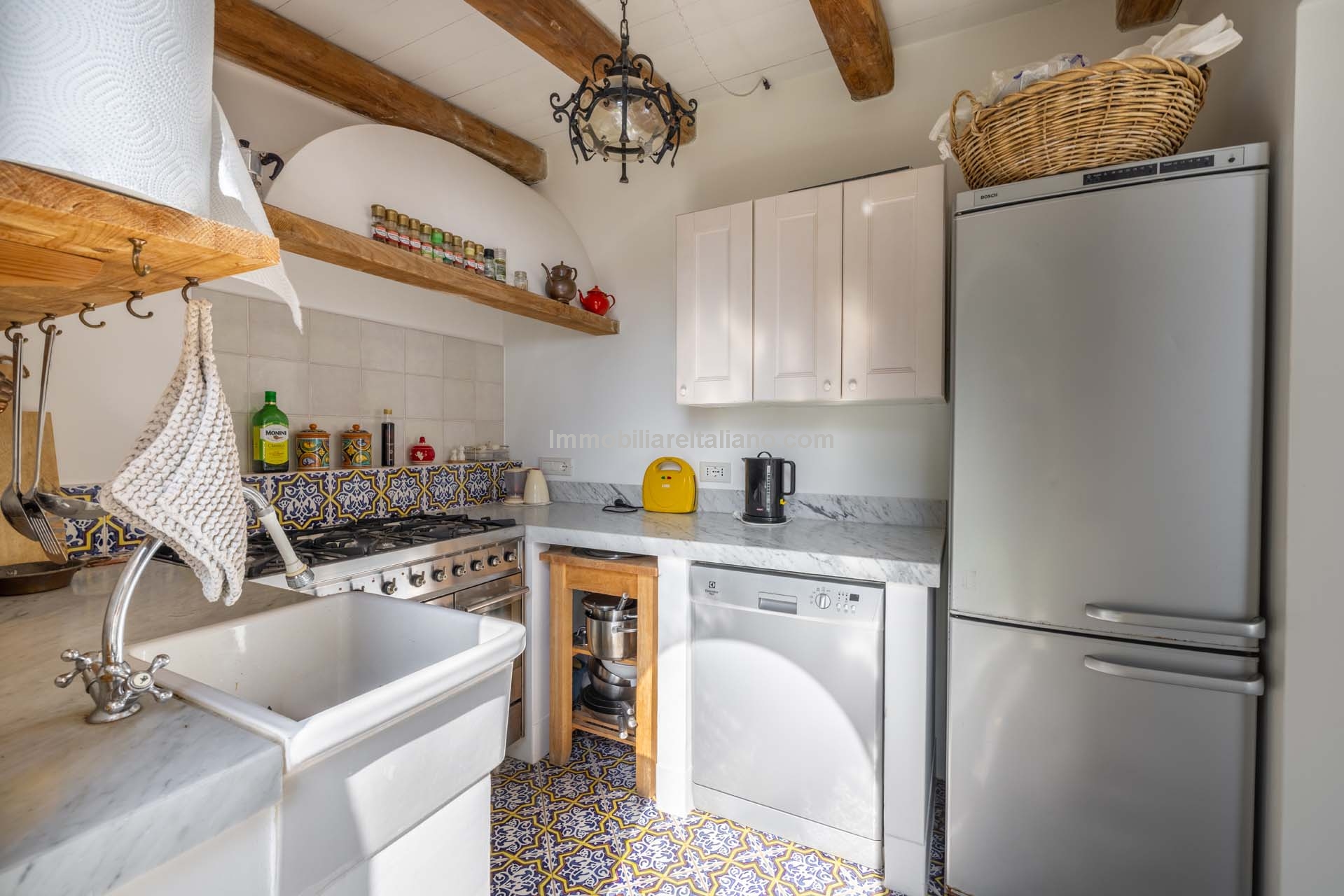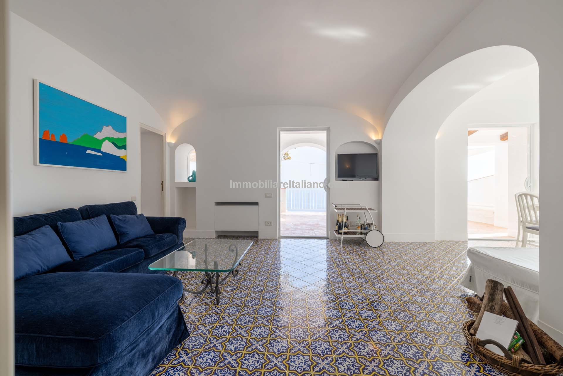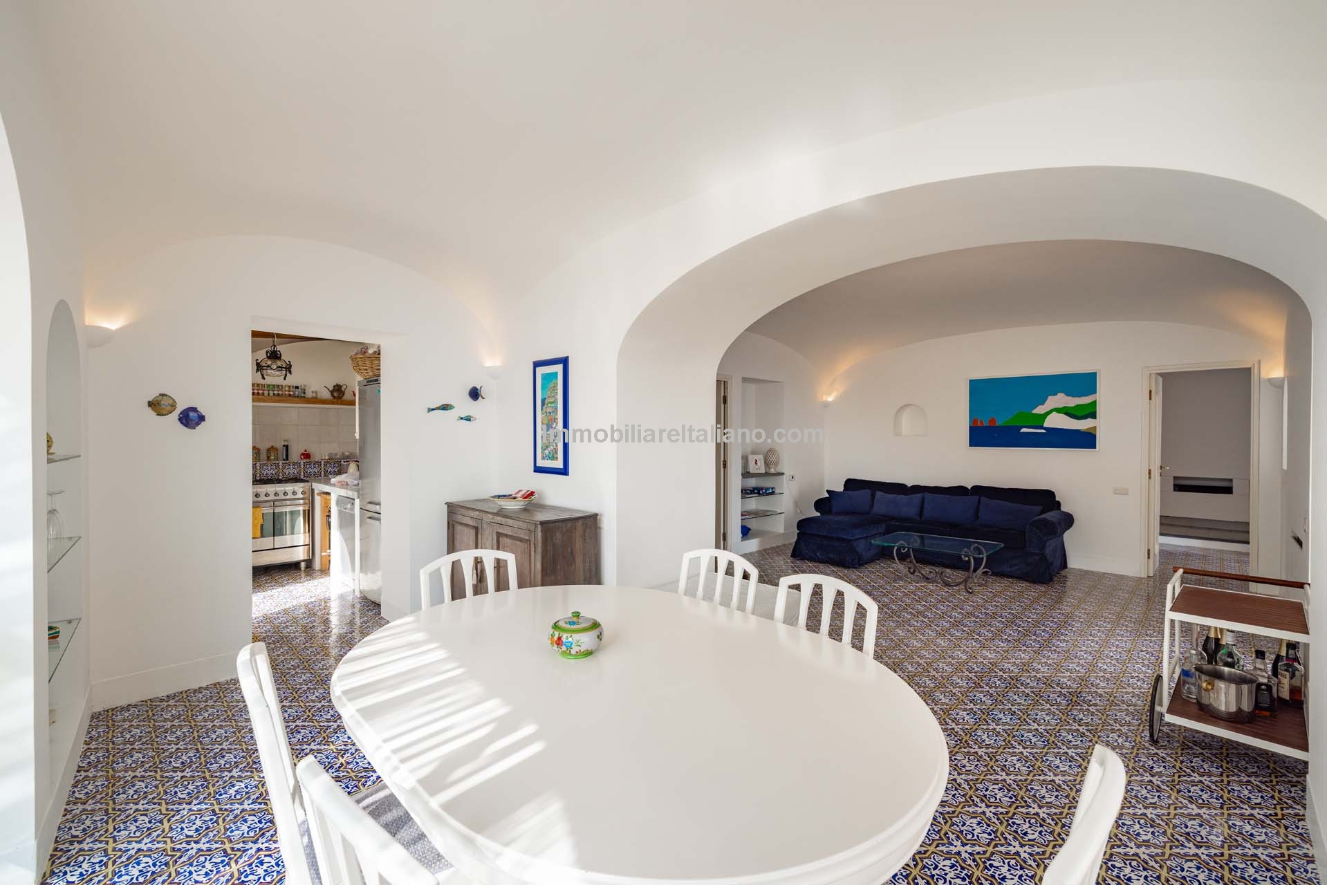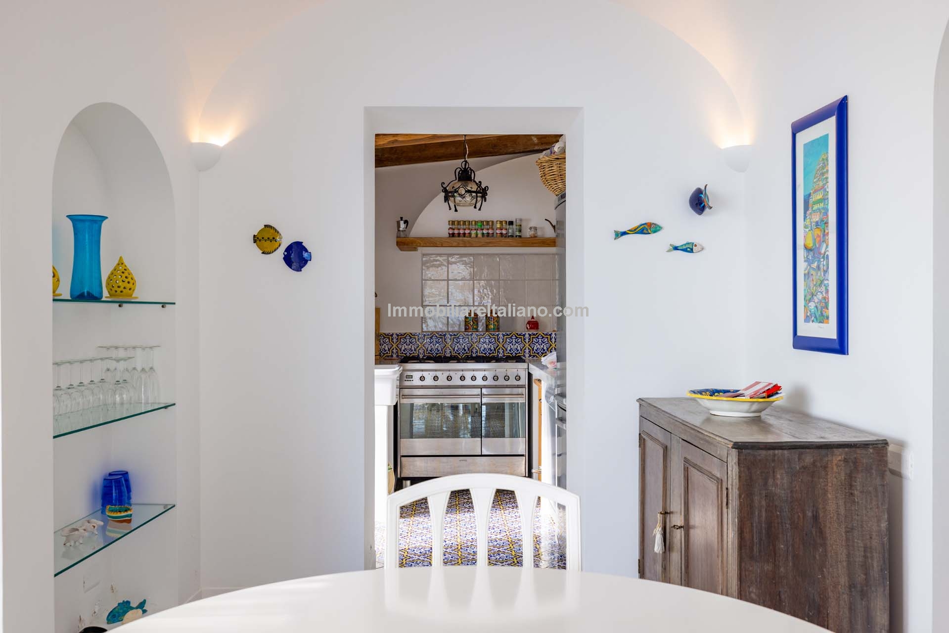 The apartment extends to approximately 113 square metres (1,216 sq ft) and is arranged on a single level. The internal layout includes a living room with a dining area connected to the kitchen, both of which open towards the sea-facing terrace. The terrace measures around 55 square metres and provides usable outdoor space with a covered portico, suitable for dining and seating while overlooking the coastline. Original architectural elements, such as vaulted ceilings, wooden beams, and decorated ceramic flooring, are preserved throughout, enhancing character and value in the Amalfi Coast property for sale segment.