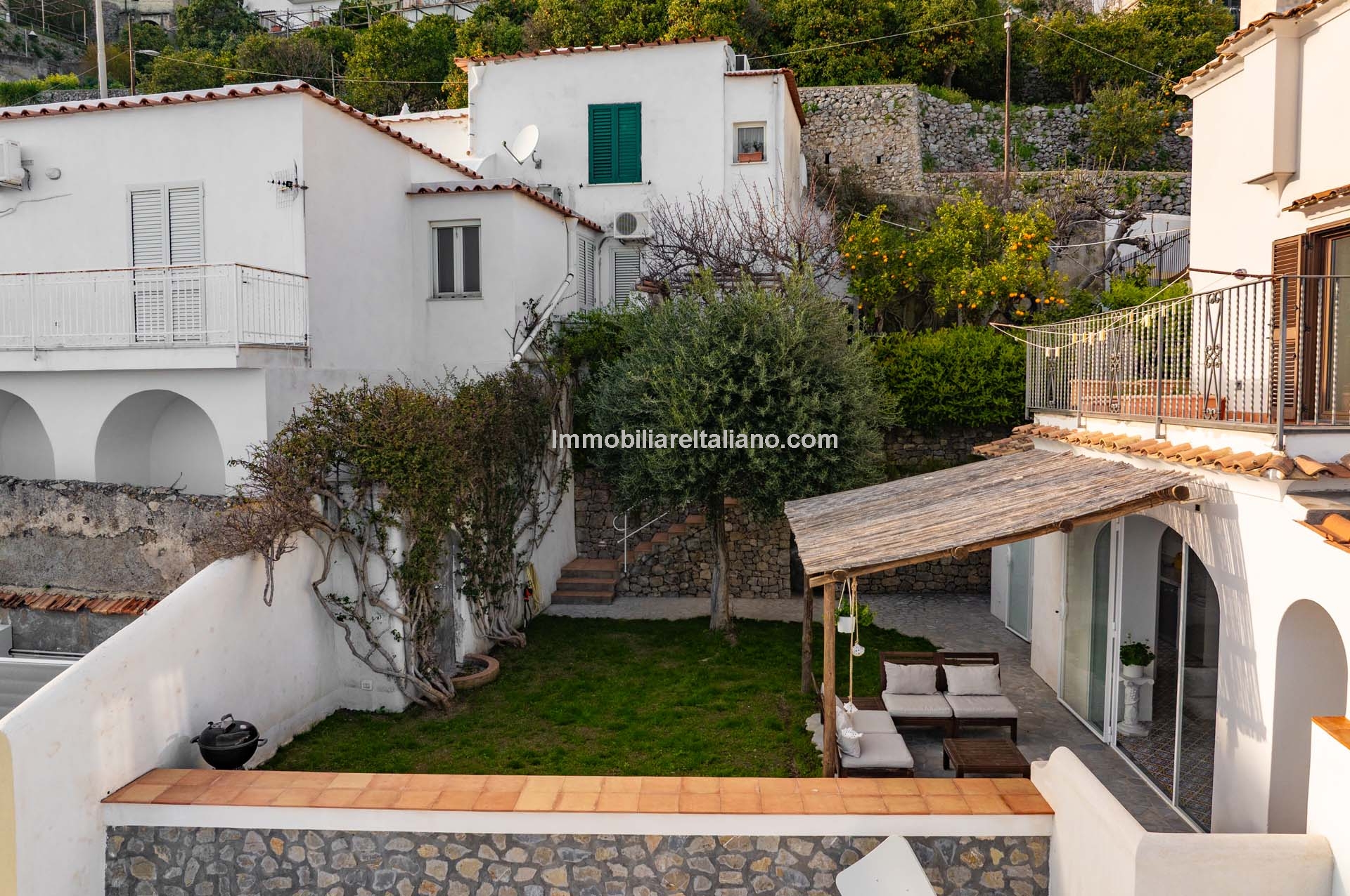 Externally, the private garden extends to approximately 145 square metres and is arranged across three terraced levels. Pergolas and shaded areas are positioned close to the kitchen, enabling practical outdoor dining and everyday living. The property does not include a swimming pool but offers multiple outdoor areas, which is typical for historic centre sea view apartments on the Amalfi Coast.