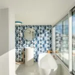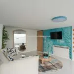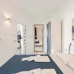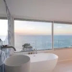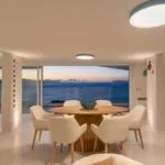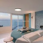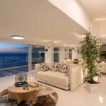 A full-height window faces the sea, offering wide coastal views and creating a seamless connection between the interior and exterior during warmer months. The property includes two terraces—one with ceramic flooring, the other in wood—as well as a large rooftop terrace with a Jacuzzi, all overlooking the water.