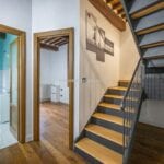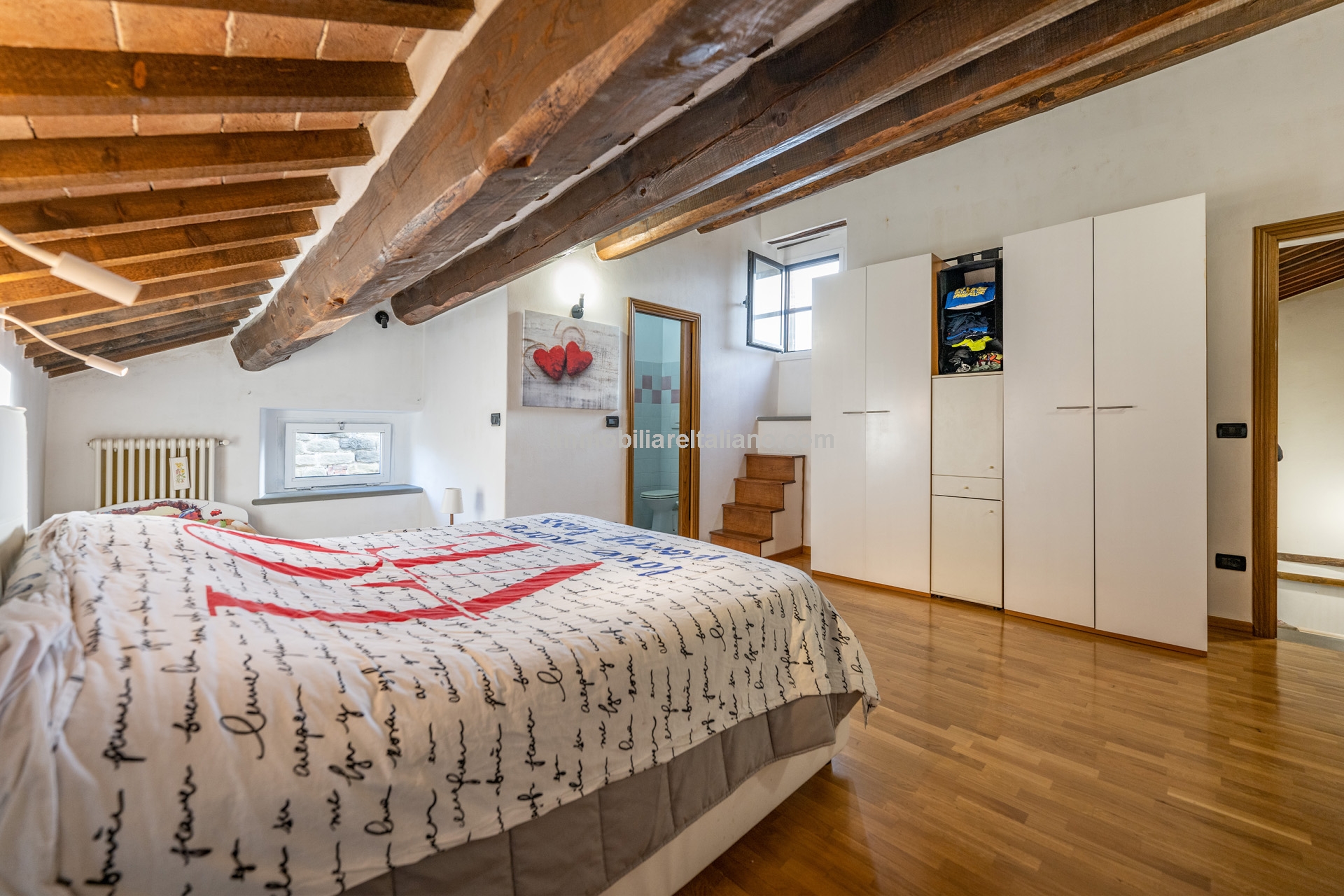 The apartment measures approximately 120 square metres (1,291 sq ft) and is arranged over the second and third floors of a historic building, accessed via a shared condominium staircase. The interior has been renovated while retaining original architectural elements typical of period properties in Tuscany, including stone and brick walls, wooden beams, parquet flooring, and a stone fireplace. Windows overlook Via XX Settembre, placing the property within one of Sansepolcro’s main historic streets.