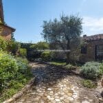 The courtyard is landscaped with flowers and plants, creating a private outdoor space ideal for relaxing or dining. A gated entrance ensures privacy, and the surrounding garden, with olive trees, fruit trees, and colourful flowers, enhances the property’s charm. The garden’s size and setting make it a potential venue for events, with the scenic backdrop of the historic monastery.