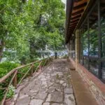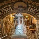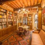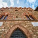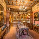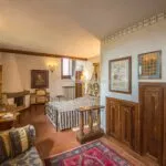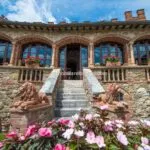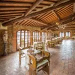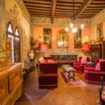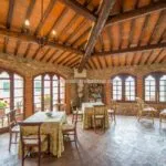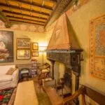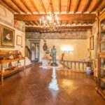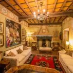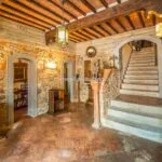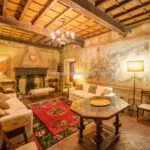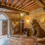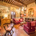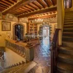 Architectural features include original stone and masonry walls, Florentine mullioned windows, Guelph-style crenellations, and a striking arched loggia leading to an Italian garden. Inside, the castle retains its historic character, featuring terracotta floors, exposed stone walls, frescoes, decorative fireplaces, and wooden-beam ceilings. Large windows, some with stained glass, bring in natural light, enhancing the sense of space.