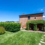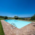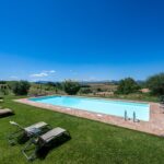 The estate also offers a 14 × 7 metre swimming pool, set slightly apart from the central structure, providing a tranquil spot to unwind. The short walk to the pool is framed by breathtaking views of the Umbrian-Tuscan hills, with the picturesque village of Montepulciano in the distance, ideal for leisurely moments with family and friends or relaxing with a book and a glass of wine.
