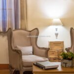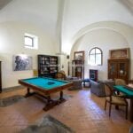 The main building, a charming boutique hotel, features 870 square metres (9,361 square feet) of space, including 15 bedrooms and 18 bathrooms. The ground floor boasts a series of expansive salons connected by elegant arches, flowing into a bright veranda that seamlessly links to the outdoor garden, perfect for enjoyment throughout the seasons. To the left of the ground floor is the monastery’s former chapel, now transformed into a hobby room complete with bookshelves and a billiards table, offering a delightful retreat.