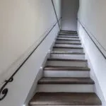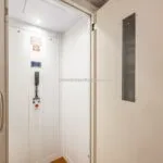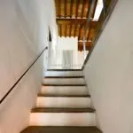 The townhouse spans 100 square metres (1,076 square feet) over three levels, all connected by a modern lift. The ground floor features an entrance leading to a living area with a modern kitchen and spacious dining room, separated by a large original brick arch, and a bathroom. A stone staircase with LED spotlights ascends to a hallway accessing a large bathroom with a shower, a spacious bedroom, and a laundry area with a washer and dryer. The top level features an open space currently used as a living area with an office corner, which can be easily converted into a second bedroom with an en-suite bathroom, as all necessary facilities are pre-installed.