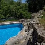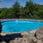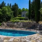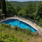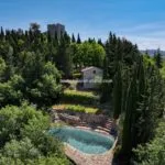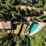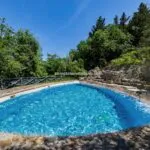The castle’s beautiful garden, surrounded by trees, extends over approximately 4,700 sqm and gently slopes down to a panoramic 16 × 8 m swimming pool set among the rocks and travertine.