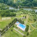 The estate includes 15,000 sqm of landscaped parkland, a 20 × 10 m swimming pool, and a tennis court for guests.