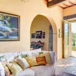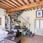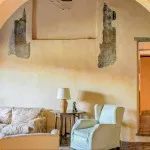 The meticulous renovation has preserved some of the details of the original building, like round arches and motifs of the Early Middle Ages. Tastefully painted with pastel colors, the cozy rooms of the ground floor boast original frescos on the walls.