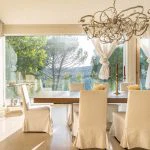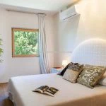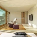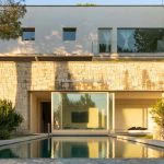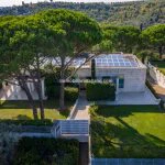 The villa was constructed using sustainable building techniques and is equipped with modern systems that utilise geothermal and solar energy. Interiors are finished in light tones, with white walls, parquet and travertine flooring, and large windows that connect indoor and outdoor spaces.