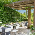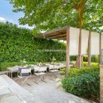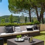 The 3,060 sqm (0.75 acres) garden is arranged over three terraced levels, enclosed and landscaped with olive trees, decorative plants, and Mediterranean shrubs. Adjacent to the main living area is a shaded outdoor lounge area beneath a sycamore tree, and nearby is a pergola-covered dining space with a built-in BBQ and sink. On the lower terrace is a 12 × 3 metre infinity-edge swimming pool with valley views, accompanied by lighting and a surrounding sunbathing area featuring a hot and cold outdoor shower.