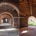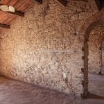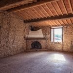 The main farmhouse measures approximately 904 sqm (9,727 sqft) and has already undergone structural consolidation, including walls and roofing. Internal works remain incomplete, with original elements such as vaulted ceilings, exposed wooden beams, and brick arches preserved. The proposed layout includes a reception area, multiple living and leisure rooms, a wine cellar, and a wellness area with steam bath and sauna. The first floor includes a large master suite and three additional en-suite bedrooms.