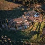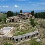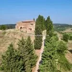 Tuscan farm estate for sale near Pienza with 46 hectares of land, a 15th-century farmhouse, outbuildings, vineyard, olive grove, and development potential for a luxury home or boutique hotel.