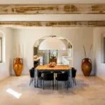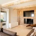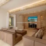 Finishes include stone and brick external walls, exposed wooden beams, travertine floors on the ground level, oak parquet on the upper floor and high-quality bathroom fittings. The villa is also equipped with a video surveillance system, an alarm, a video intercom, and an electric entrance gate.