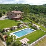 Tuscan farmhouse for sale with guesthouse, pool, vineyard, olive grove, and 12 ha of land. Renovated for Agriturismo, this property features eight bedrooms, making it an ideal home and income property in the heart of Tuscany.