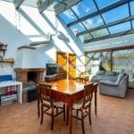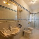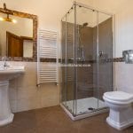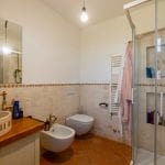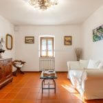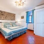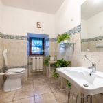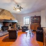 The main farmhouse (550 sqm / 5,918 sqft), originally a Lombard tower, was fully renovated in 2021. On the ground floor are a large living room with a fireplace, a hallway with a wood-burning oven, a professional kitchen with a pantry, a guest bathroom, and a bedroom with an en-suite bathroom and a living area. Upstairs are four further bedrooms, all with en-suite bathrooms, two with access to private attic storage or walk-in closets. The property also has a 45-sqm porch and a heating system powered by a pellet boiler.