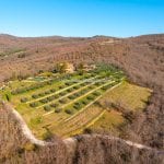 The land, surrounding the buildings in a single block, covers 12 hectares, with 5 hectares fenced. It slopes from the hilltop into the valley, offering open countryside views and overlooking a medieval village with historic fortress ruins. Agricultural elements include 3,000 sqm of vineyard, 1.3 hectares of olive grove, 7,200 sqm of lavender fields, 2,000 sqm of fruit trees, vegetable plots with greenhouses, and 2,000 sqm of hazelnut trees. Woodland areas offer privacy, trails, and shaded walking paths.