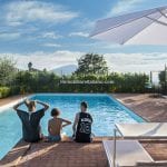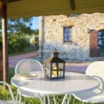 Outside, the farmhouse is surrounded by a 7,600 sqm garden with mature trees, hedges, and local plants. A short walk from the main building leads to a 12 × 6 metre swimming pool with a terracotta-paved sun deck. The property also includes a 30 sqm (323 sqft) warehouse/garage.