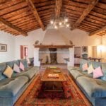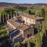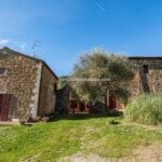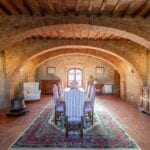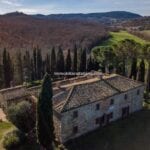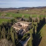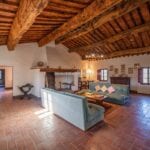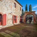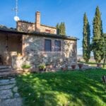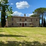 This renovated farmhouse sits on 6.5 acres of land in the Sienese hills, not far from the well-known spa town of Rapolano Terme. With its well-preserved rustic aesthetic, the property features two separate homes, 4 bedrooms for the owners and one bedroom for visitors, with a combined total of five bedrooms and four bathrooms. Some of the land could be used, if wanted, to plant a vineyard, and the centre courtyard is paved for comfortable outdoor gatherings.