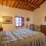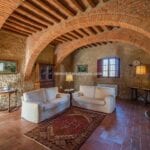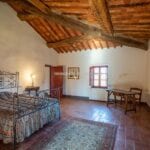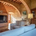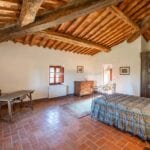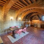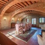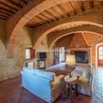 Restored farmhouse with guest accommodation, garden, and panoramic view. 5 bedrooms and 4 bathrooms. Near to Rapolano Terme in Tuscany. The property retains traditional characteristics such as exposed stone walls, stunning brick arches, wooden beams and terracotta floors.