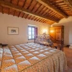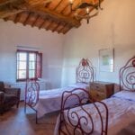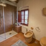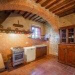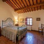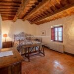 – Located in the southeast part of the farmhouse, the guest quarters span two stories and have a total size of 85 square metres (915 square feet), with one bedroom and one bathroom. The kitchen and eating area, a living room that doubles as an office and a bathroom are all on the ground floor. The bedroom is on the first story, and you can get there via the stairs in the wall. The building was meticulously restored to maintain the characteristics that set Tuscan country properties apart. Both the interior and exterior stone and brick walls have been cleaned and valorized, and it was chosen to keep the terracotta flooring and wooden beams as they were originally installed. The wooden beams on the ground floor are suspended by graceful brick arches. The sunny rooms on the first floor and the cosy atmosphere created by the red bricks make this home a great place to spend family time.