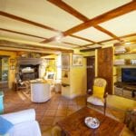 A wooden staircase leads to the second floor where there are two double bedrooms with bathroom and terrace.