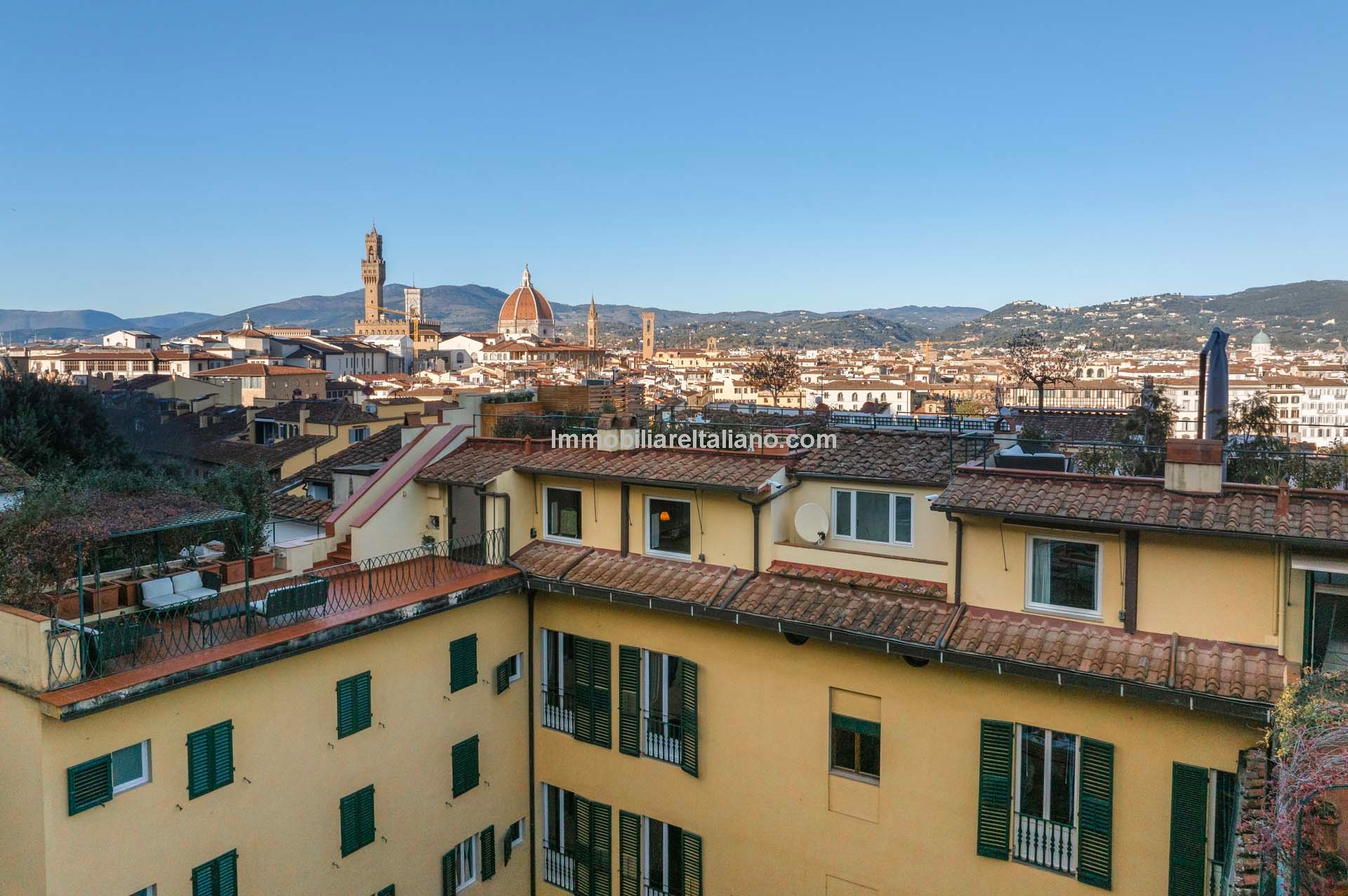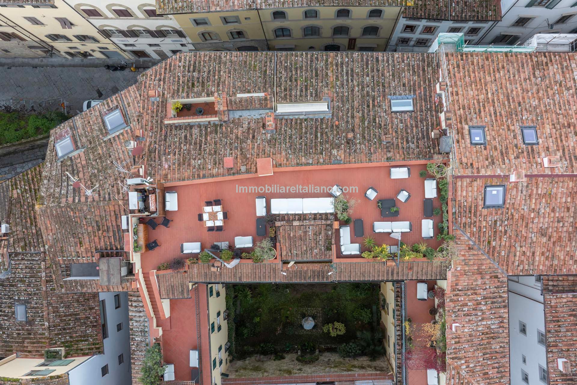 Historic Florence palazzo apartment building for sale with 9 luxury apartments, elevator, garage and panoramic roof terrace in the Oltrarno district.