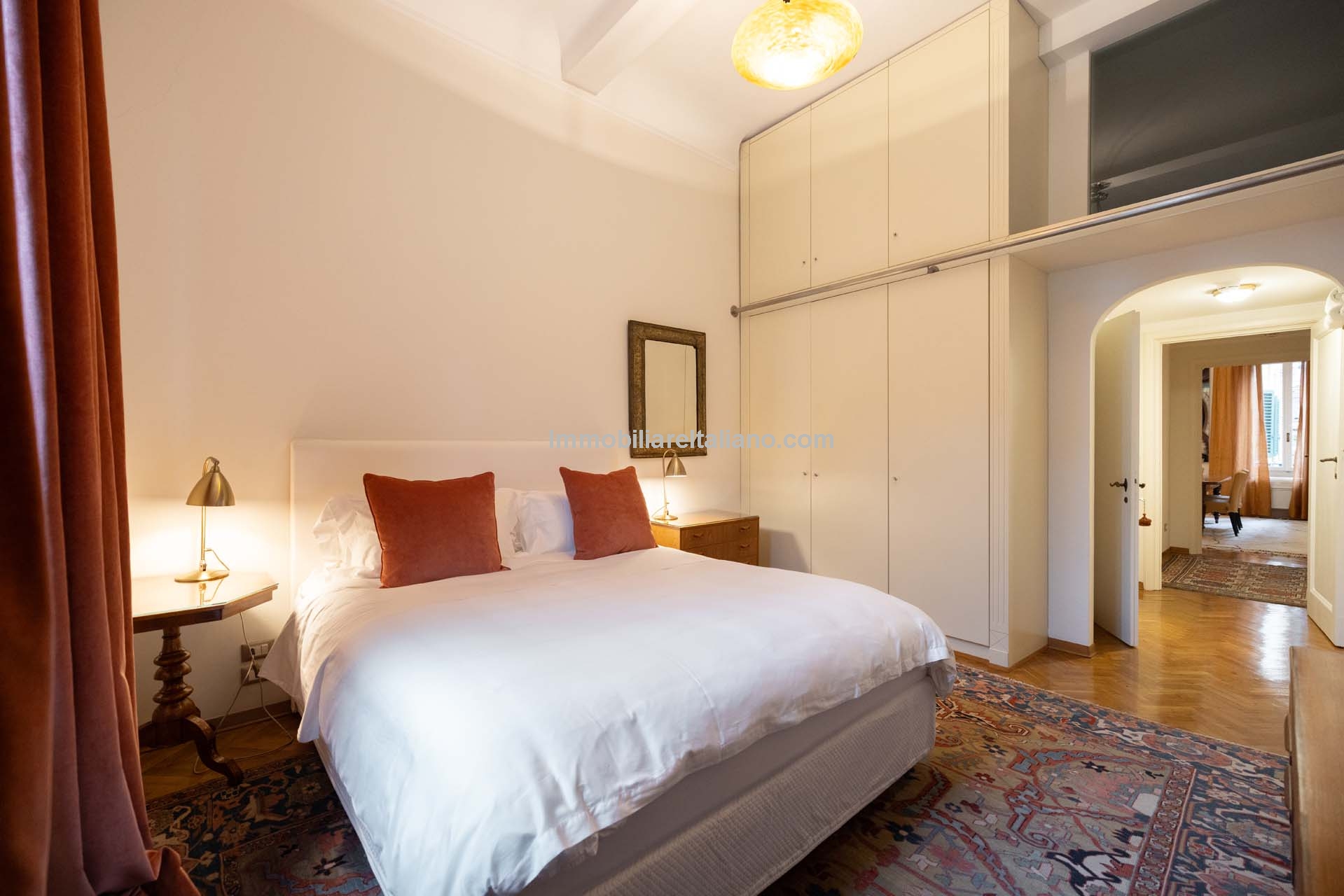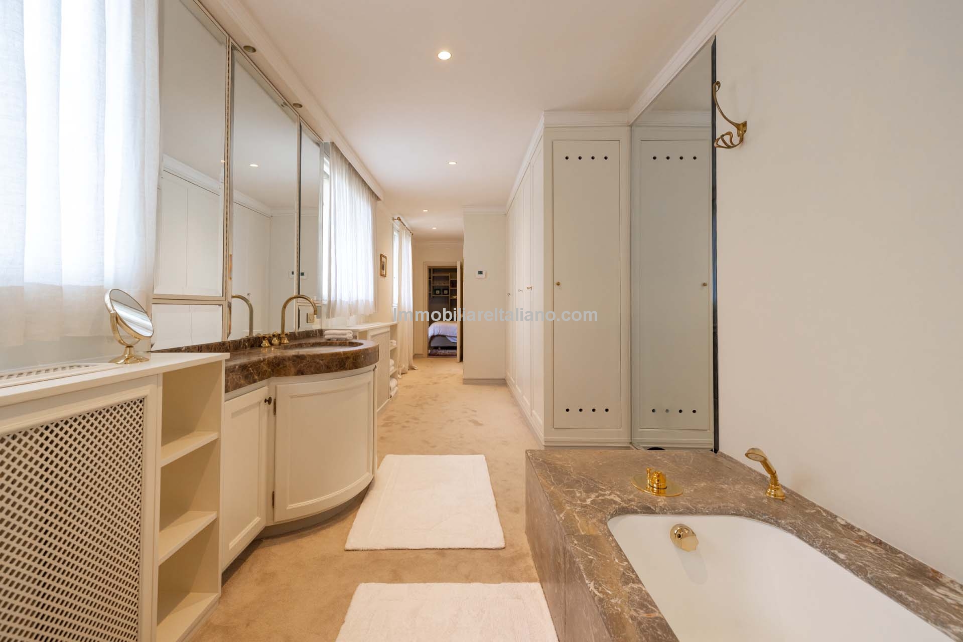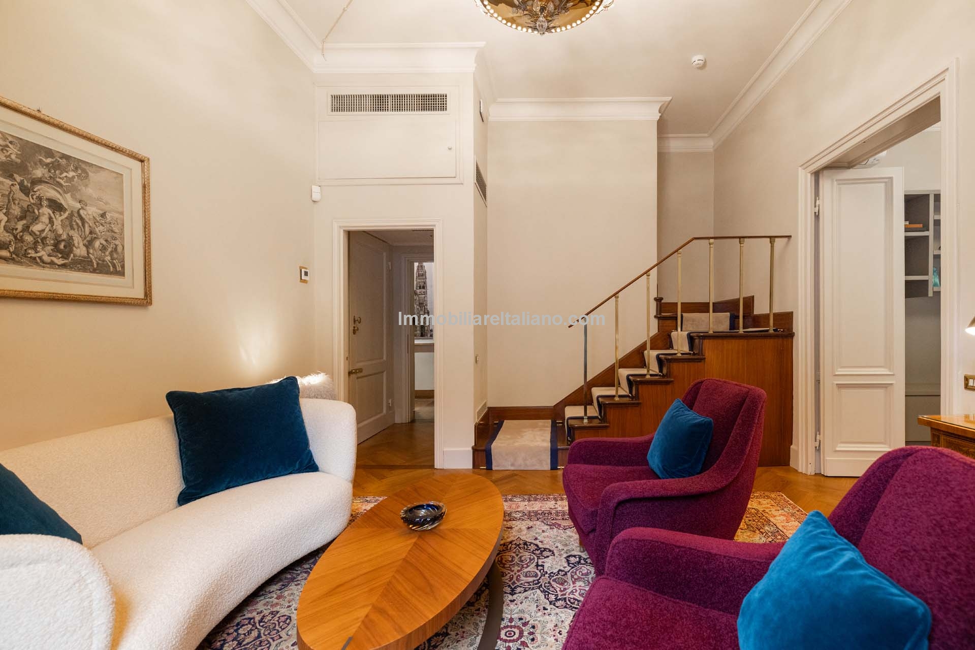 Apartment Michelangelo (338 m², 3 bedrooms and 3 bathrooms): located on the third and fourth floors, this apartment is the largest in the building. The main entrance (on the upper floor) can be reached directly via the elevator (private in the last section). On one side of the entrance are the kitchen with pantry, a bedroom and the large representative living room. On the opposite side, we find the bathroom, a games room (which can be used for various purposes as needed), a more intimate sitting room, and the large master bedroom with a private bathroom, walk-in closet, and an exit to an exclusive terrace (34 m²). A staircase from the hallway descends to the lower floor (which still has independent access): here, there is a small living room and a bedroom with a private bathroom. From the living room on the fourth floor, a door leads to the large panoramic terrace (190 m²), offering a breathtaking view of the entire historic centre of Florence and the Giardino Garden.