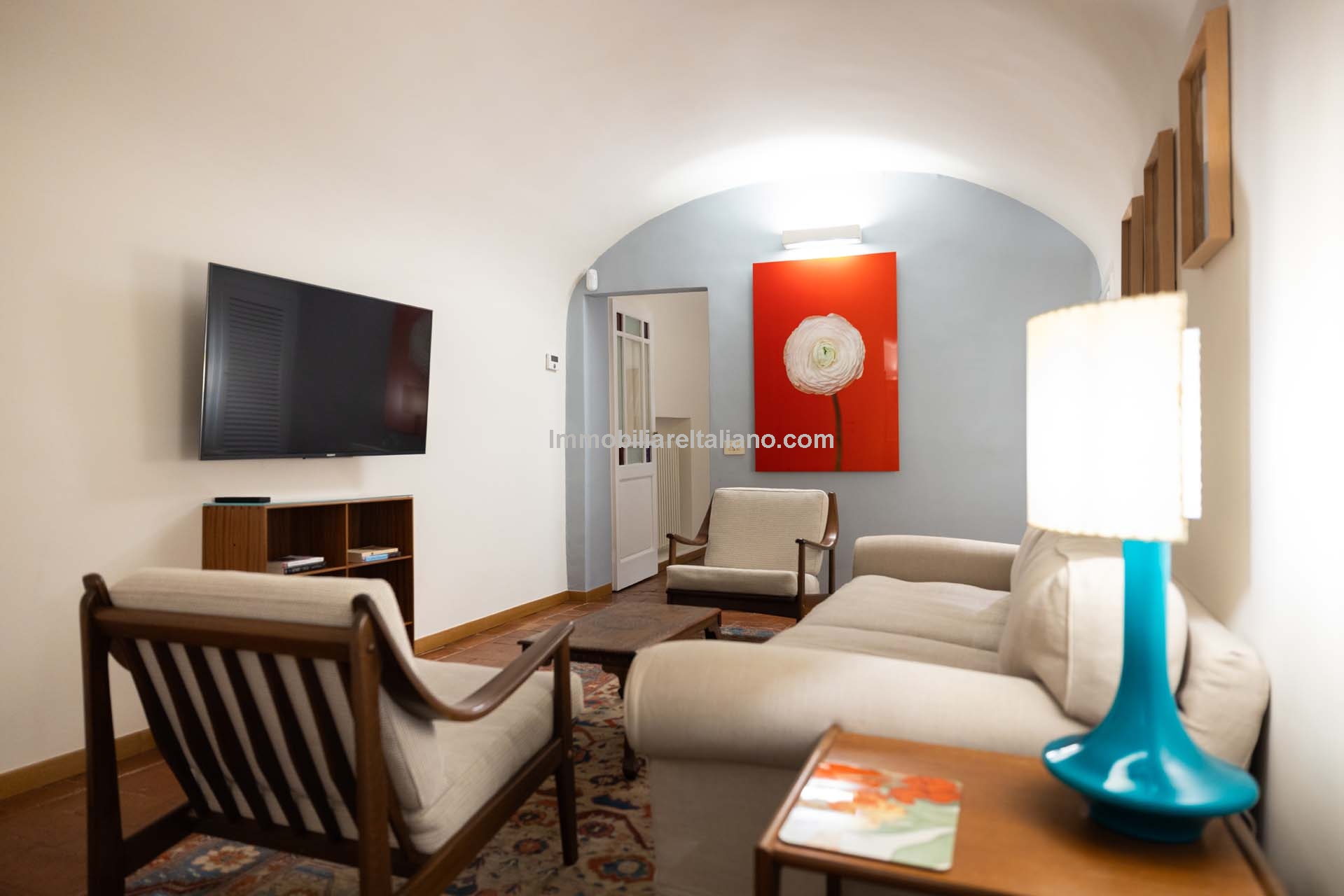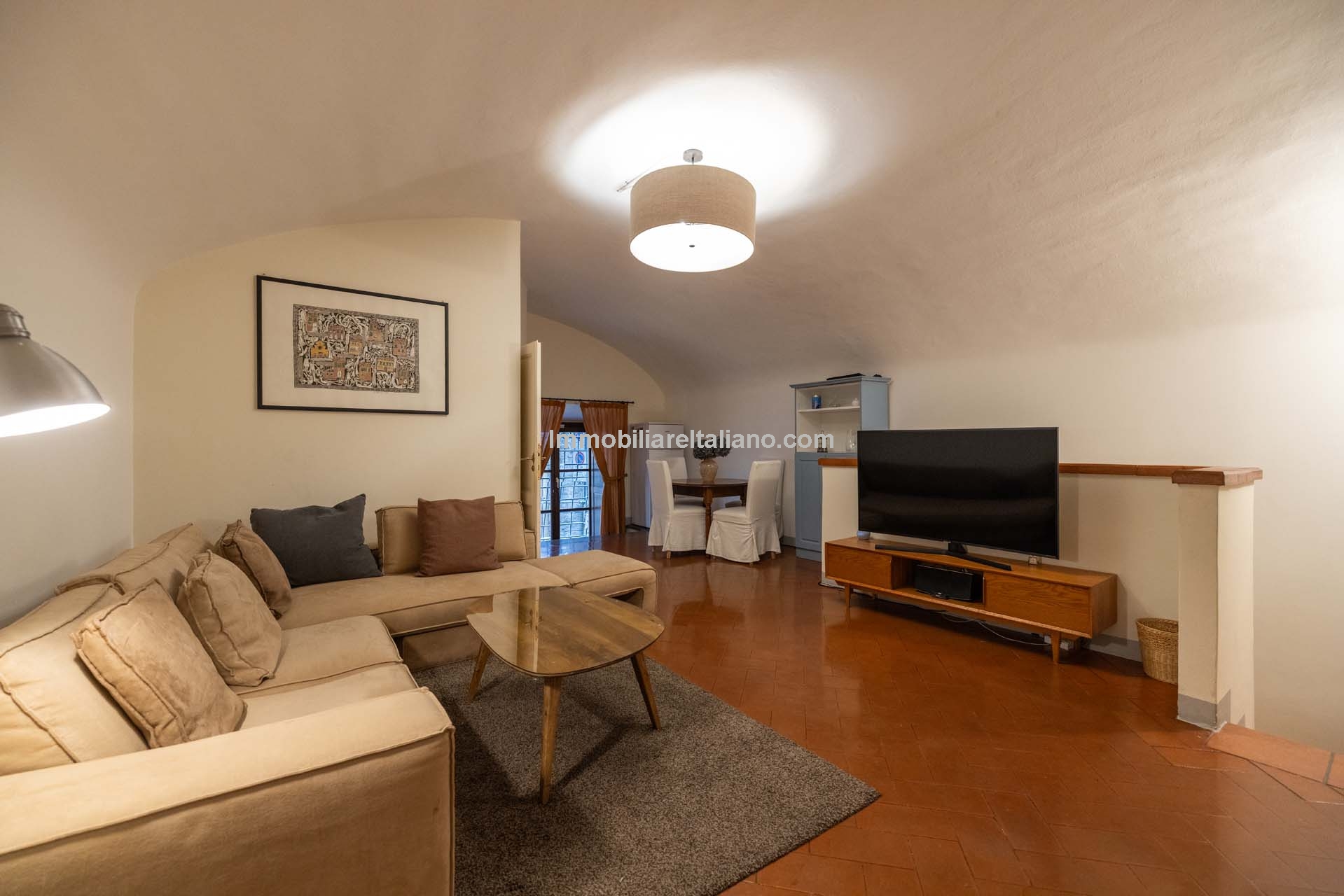 Apartment Raffaello (57 m², 1 bedroom and 1 bathroom): the door to the apartment is on the second landing of the condominium staircase and opens onto a living room with a dining area and kitchenette, connected to the bedroom (overlooking Via de’ Bardi) and a bathroom.