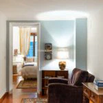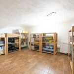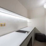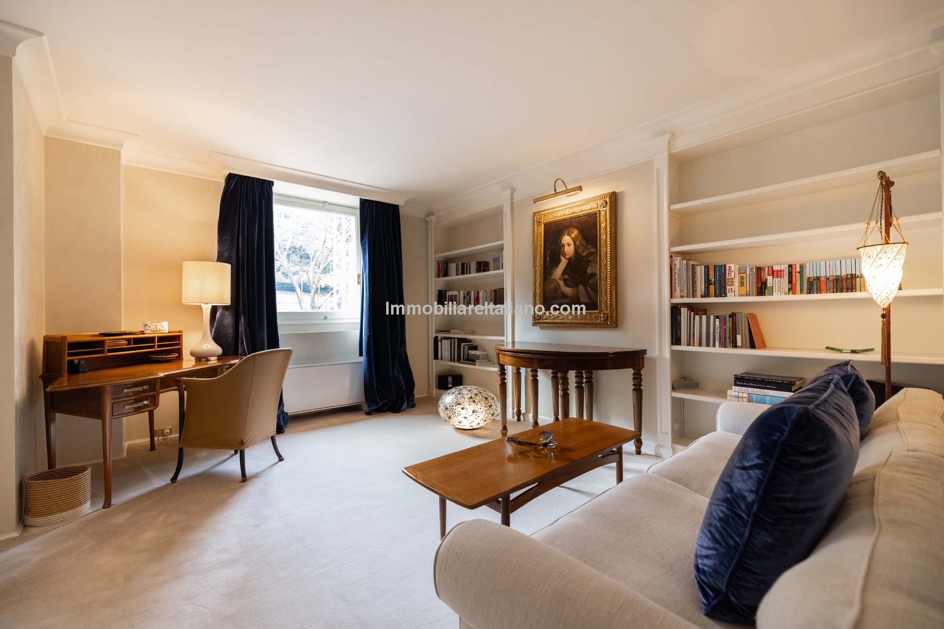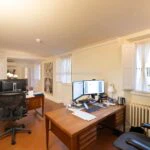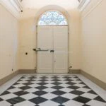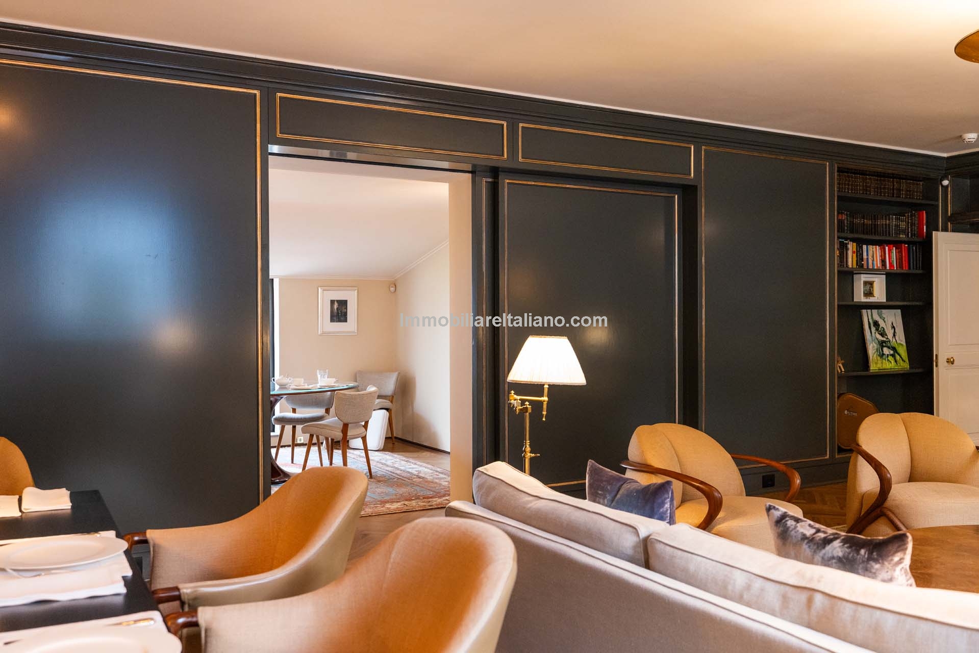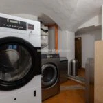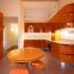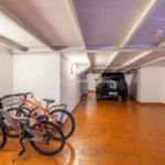 Apartment Giotto (147 m², 1 bedroom and 2 bathrooms): also on the ground floor, the unit is accessible directly from the street or the condominium hallway and is currently used by the property’s janitors. The two doors open onto a living room with a bathroom, connected at the rear to the laundry room. Climbing an internal staircase leads to the dining room with an adjoining kitchen and the bedroom with a bathroom and a walk-in closet.
