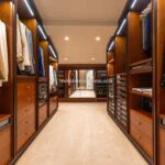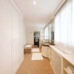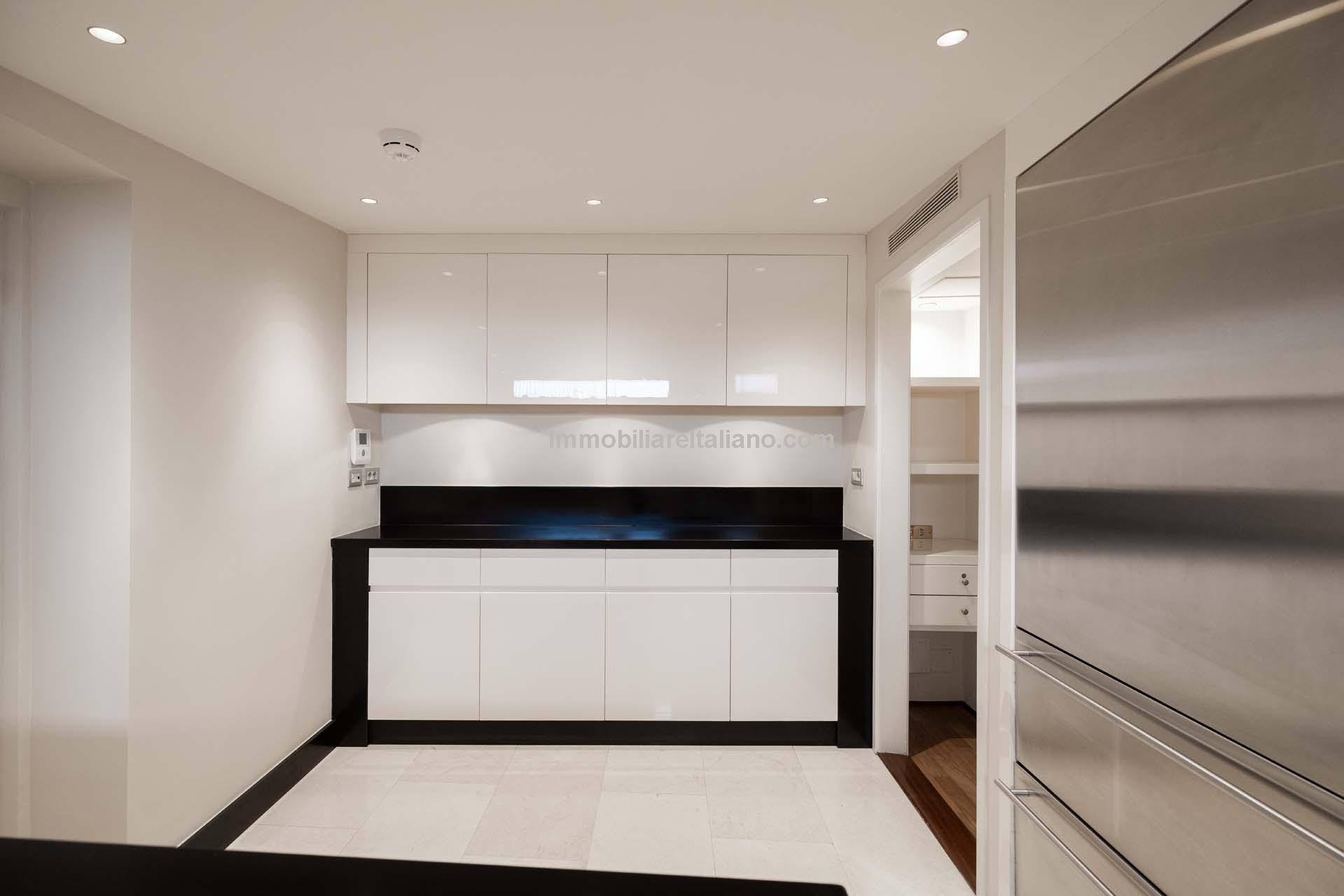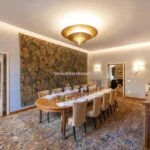 Apartment Botticelli (264 m², 3 bedrooms and 4 bathrooms): next to the Leonardo apartment, the unit opens to a small entrance hall, which connects to the large reception hall and a service bathroom. Next to the hall are the dining area and kitchen with pantry, while at the corners, two doors lead to three bedrooms with en-suite bathrooms and walk-in closets (one of the bedrooms is accessible by descending a short staircase).