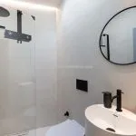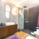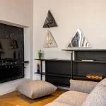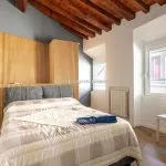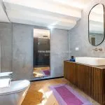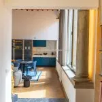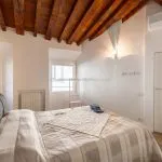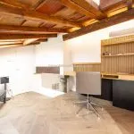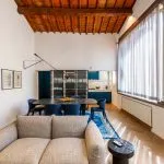 The main living room, once the palazzo’s loggia, retains original pietra serena stone columns and exposed wooden beams. Large windows fill the space with natural light. The modern, fully equipped kitchen blends seamlessly with the living area. Two bedrooms, each with an en-suite bathroom finished in contemporary resin, form the sleeping area. A mezzanine level provides a study space, while a separate utility room houses laundry appliances.