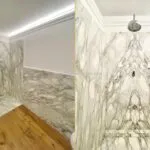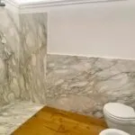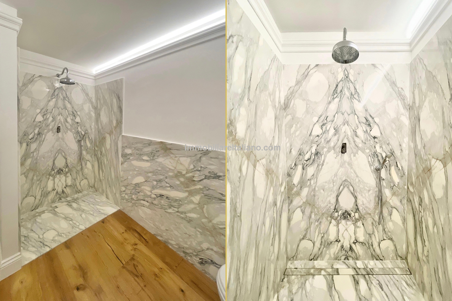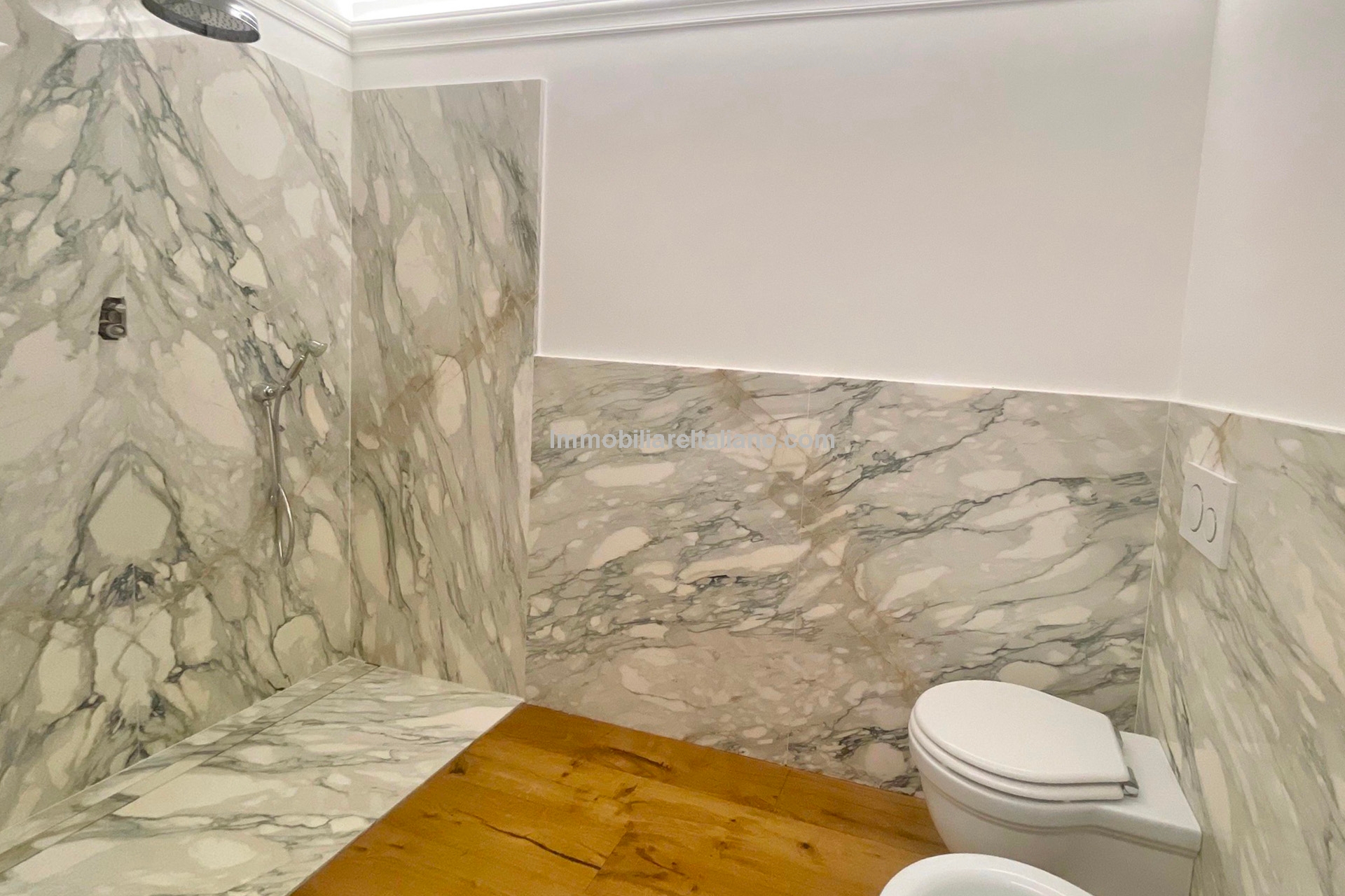 The bathroom is finished in marble and includes a large walk-in shower. A separate storage and wardrobe room adds practical space rarely found in studio apartments in Florence’s historic centre.