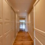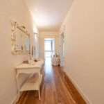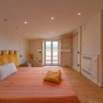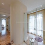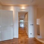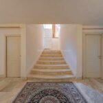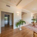 The central staircase, with its sinuous and artistic shape, reaches then the first floor. The central landing leads to the left into two bedrooms with a private bathroom and an exit onto the shared terrace. Similarly, on the other side, the hallway leads to two more bedrooms with a private bathroom and an exit onto a shared side terrace.