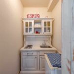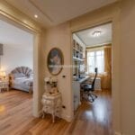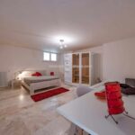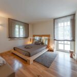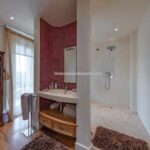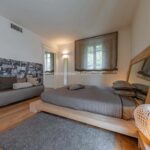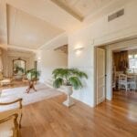 The ground floor, accessed directly from outside via a beautiful staircase with loggia, is home on one side to a cosy kitchen (including its own pantry) with a dining room and French windows opening onto a poolside loggia. On the other side of the floor is a generous and very bright living room with a bathroom and exit onto a private veranda and the garden surrounding the building.