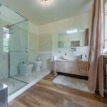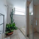 Across the garden and the pool area from the main villa, is the guest villa with a surface area of 190 sqm – 2,045 sqft with 4 bedrooms and 2 bathrooms). This building, similar in style to the other house, has three floors as well.
