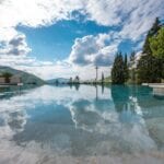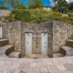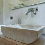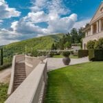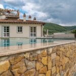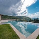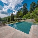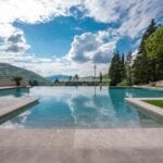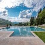 The one next to the main villa (12 × 7 m with a constant depth of 1.5 m) is an Infinity-edge pool overlooking the underlying valley and is surrounded by a travertine-paved sunbathing area with a Roman staircase descending into the water.