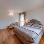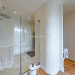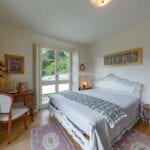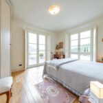 A winding staircase at the centre of the building reaches the ground floor. Here is another independent unit with direct access to the garden. Half of the floor makes up the living area with a bathroom, while the other half is split into two bedrooms with a shared bathroom between them. The staircase then goes further up to the bedroom in the tower, which has its own private balconies.