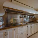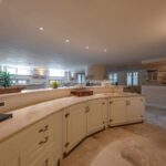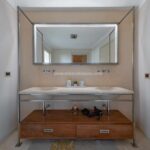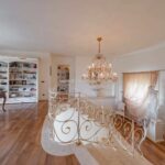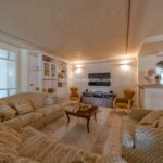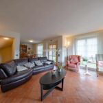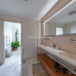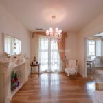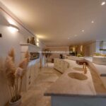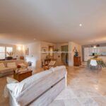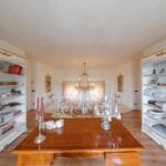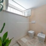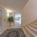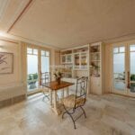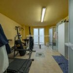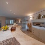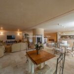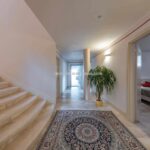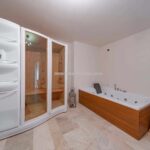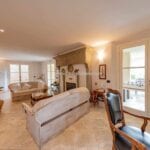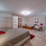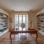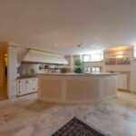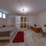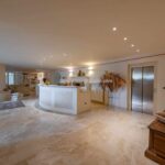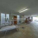 The main villa has a surface area of 755 sqm – 8,127 sqft with 6 bedrooms and 6 bathrooms over three floors which are connected by a very convenient elevator. The lowest one, partially underground, is dominated by a huge living area with a central fireplace, kitchen corner and TV room. The central hallway leads into two bedrooms and a bathroom. On the opposite side of the floor from the living area are a laundry and a huge garage (over 100 sqm) with direct access from the apron at the side of the house.