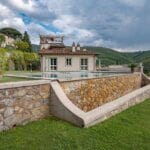 The other one (11 × 5.5 m with a constant depth of 1.5 m) is located next to the guesthouse and is similar in shape to the previous one, albeit without a Roman staircase. A travertine-paved sunbathing area contours this pool as well and the garden itself completes the private corner of the building.