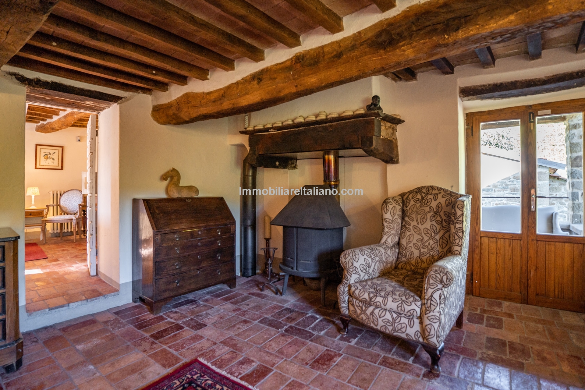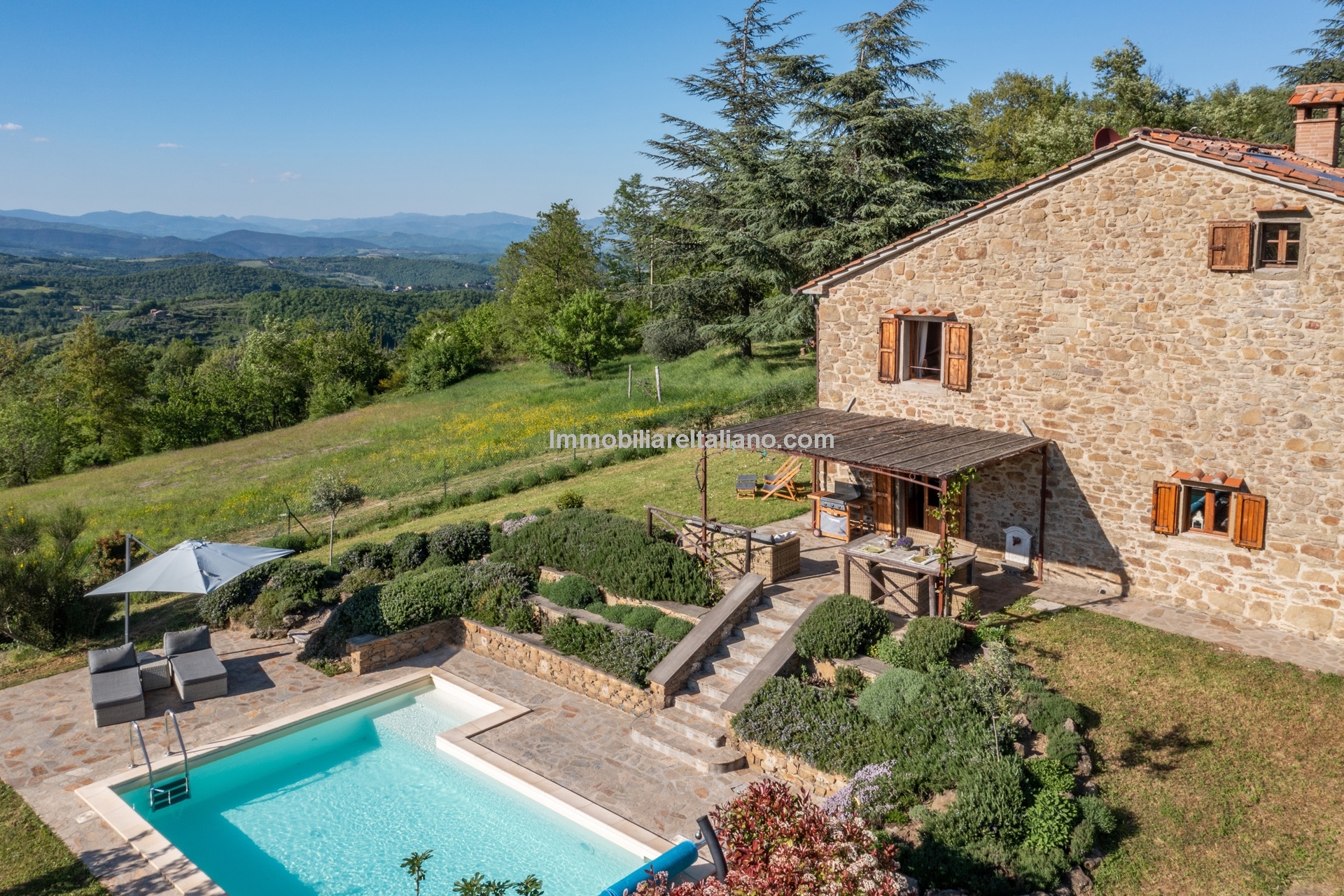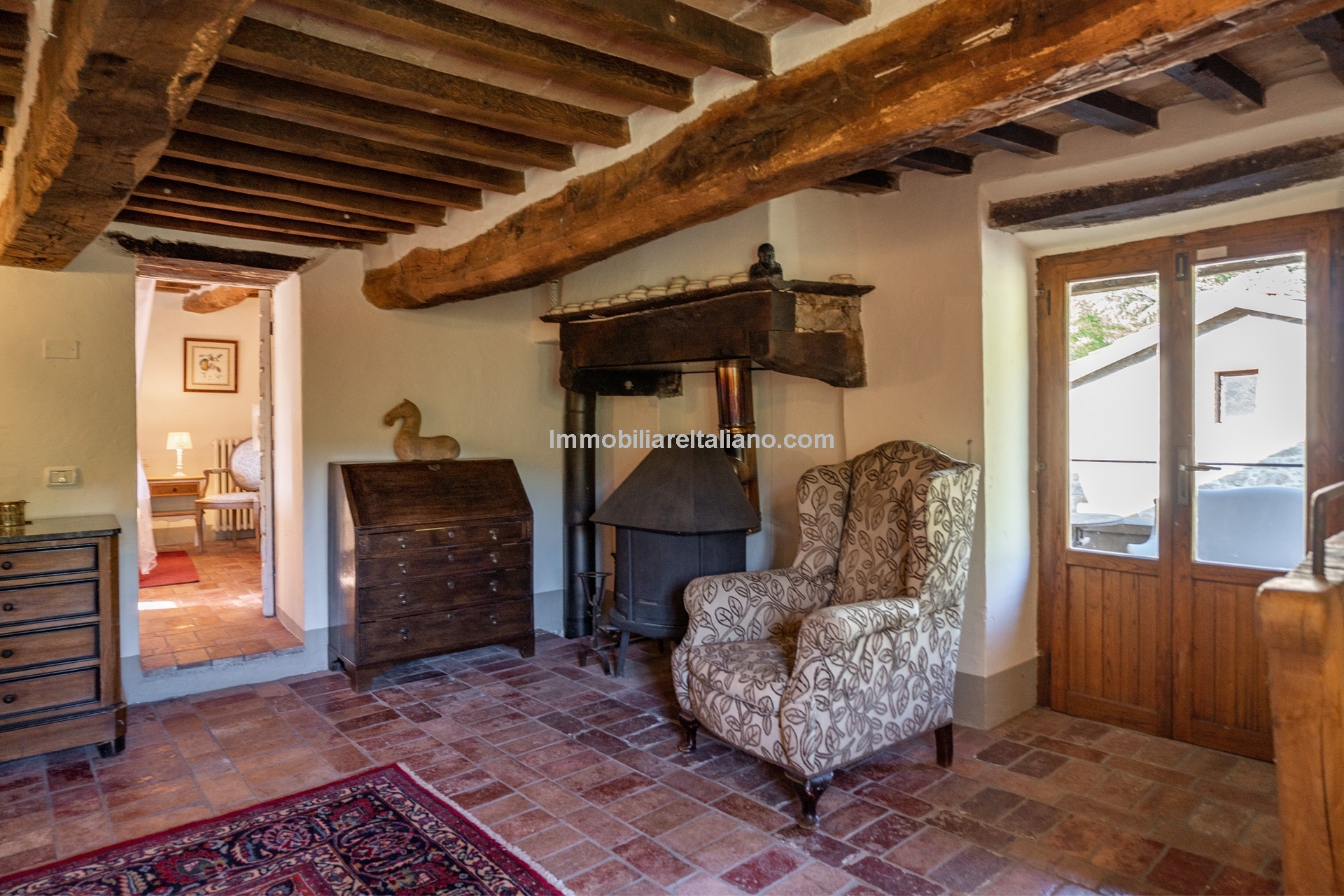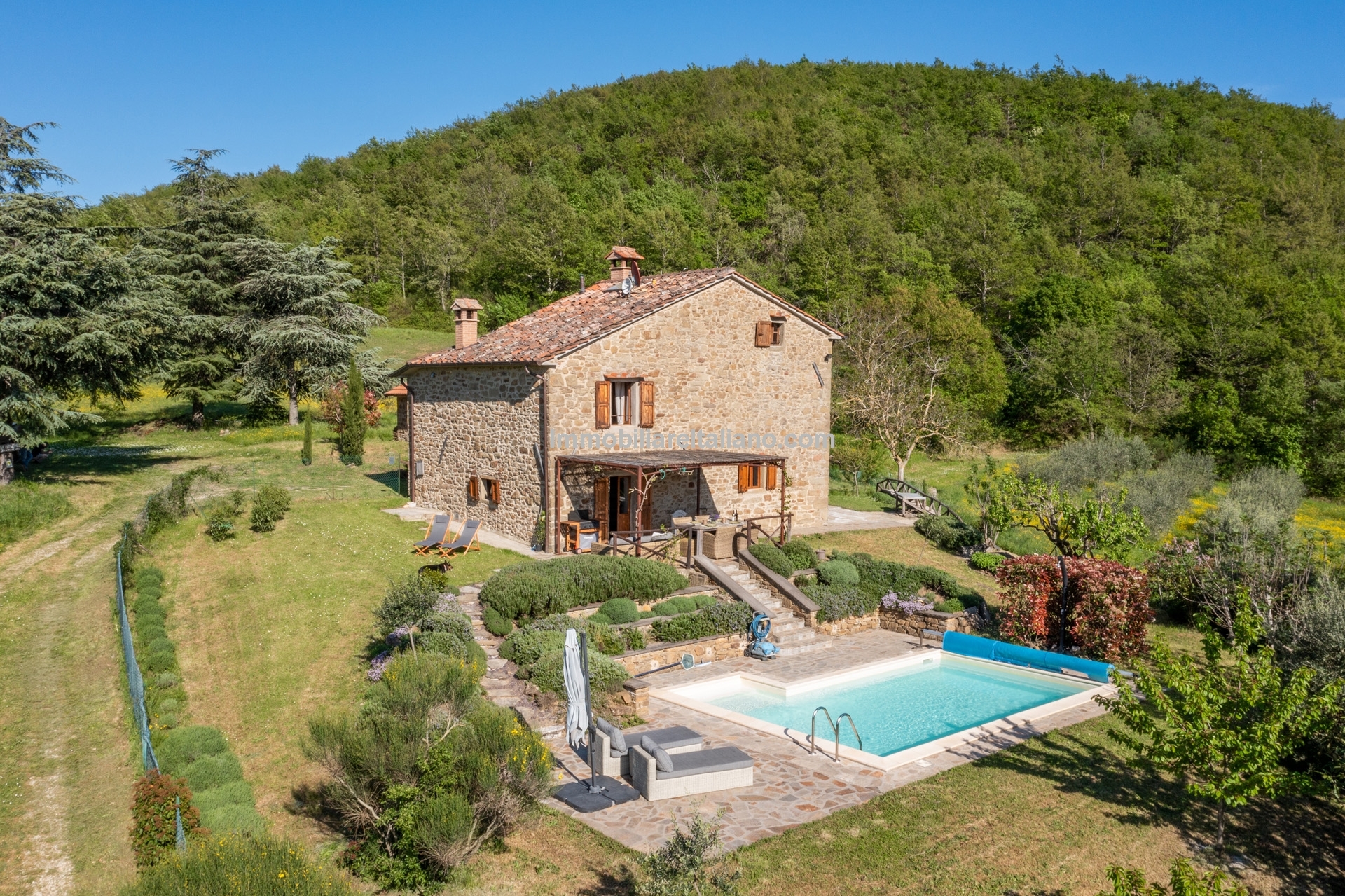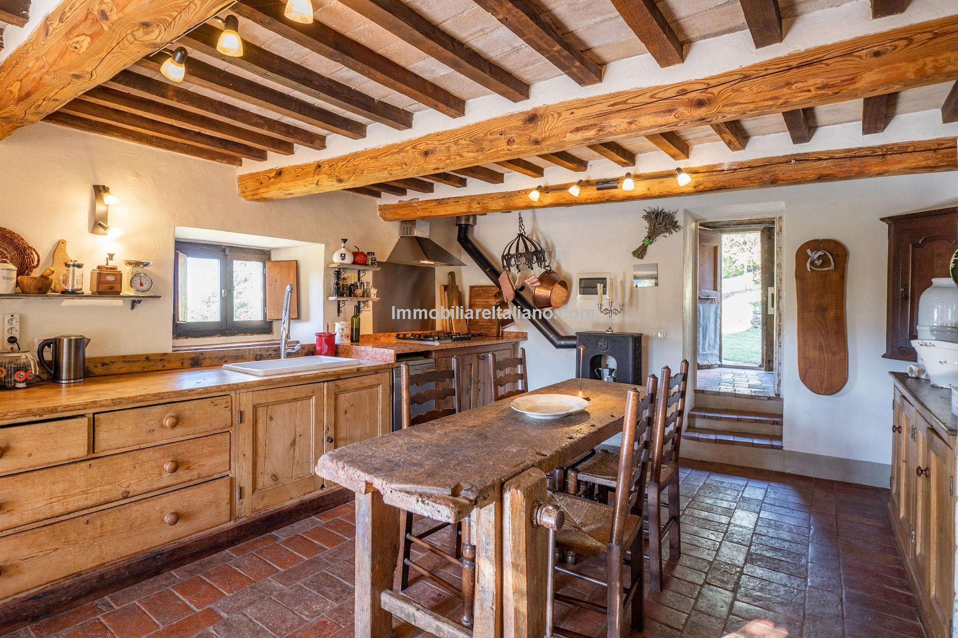 - MAIN FEATURES: Stone and brick walls, wooden beams, terracotta floors, wooden fixtures, original fireplaces, pizza oven, mature garden, swimming pool, stone-paved sunbathing area, olive trees, furniture included