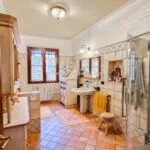 Access to the property is via a picturesque alley from the main village street. Inside the gated grounds, the expansive park is bordered by mature trees and a stream. The space could easily accommodate a swimming pool and/or outdoor entertainment and leisure areas.