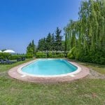 The 12×6 m swimming pool with Roman steps and chlorine filtration system is not far from the villa, surrounded by trees and hedges. The grass sunbathing area surrounding the pool has umbrellas and gazebos and is ideal for relaxing.