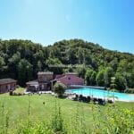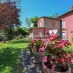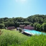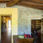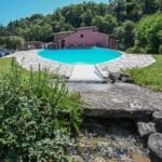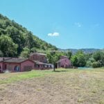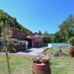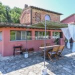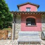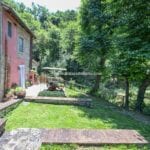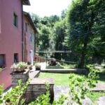 Restored 18th-century historic mill for sale near Bucine in Tuscany, divided to make 3 apartments plus a separate guest unit, a total of 8 bedrooms, gardens, pool, and riverside location. Currently used for vacation rentals.